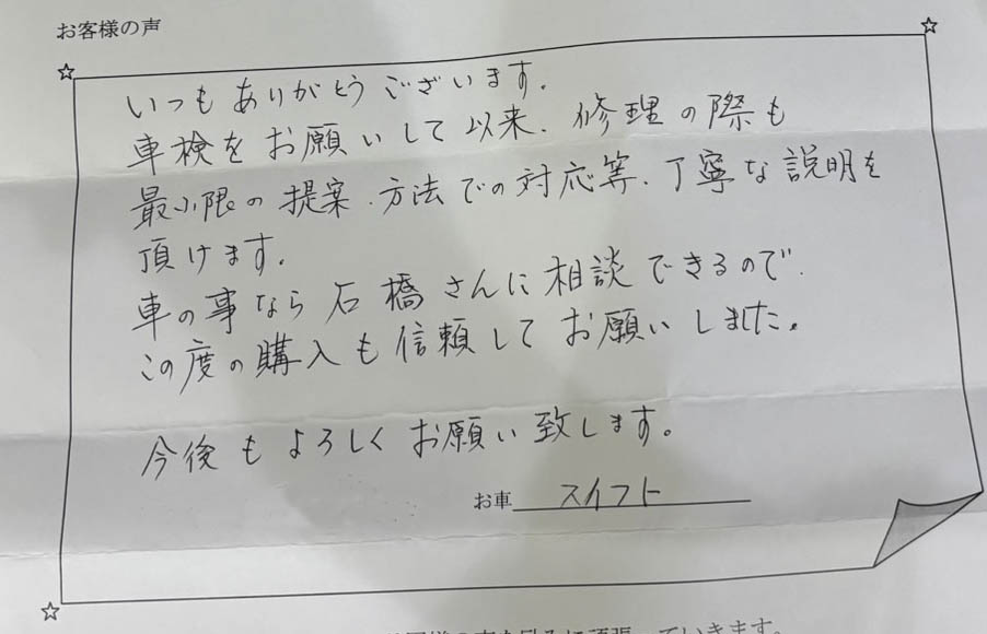 【お客様の声を頂きました】 2月 24, 2026 nooneblog customer, information No comments yet ありがとうございます。 お客様からの意見が私共の励みとなります。 これからもナンバーワンを宜しくお願い致します。
